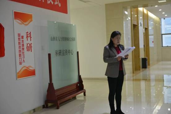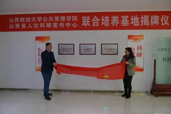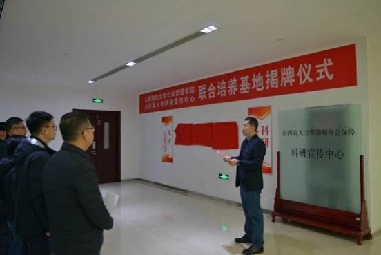 在随后举行的员工联合培养基地揭牌仪式上,经理郭淑芬首先发表了致辞,她说,此次签约和揭牌仪式是双方立足于服务国家和地方战略需求,加强高校和地方政府科研机构深度合作,实现优势互补与合作共赢的重要举措,双方在劳动经济、人力资源管理、社会保障、劳动关系等多个研究领域高度契合,现有的人才队伍和研究成果为彼此之间开展高水平合作催生了动力、架起了桥梁、结成了纽带、奠定了基础,希望双方瞄准人力资源和社会保障事业高质量发展的现实需求,整合科研、人才和组织优势资源,坚持创新引领和顶天立地相结合,共筑学术平台、共聚科研力量、共建新型智库、共研重大项目、共做调查研究、共育创新人才,努力产出具有前瞻性、战略性、建设性的高水平成果,为助力山西实现高质量发展贡献智慧和力量。科研宣传中心主任赵军在致辞中指出,签约和揭牌仪式的举行标志着双方在科研合作和人才培养上的合作联姻,更意味着高校智力资源与政府科研机构的携手共进,希望双方同向发力,加大在科研合作和人才培育的投入力度,提升科研能力和人才支撑保障,将联合培养基地打造成一个真正意义上培养复合型、研究型人才的基地。