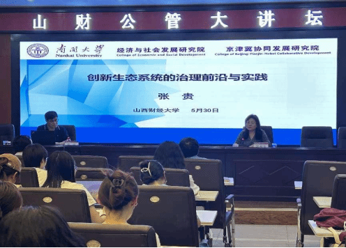 2024年5月30日下午,山财公管大讲坛第12讲在博学楼二层大会议室举行,南开大学京津冀协同发展研究院张贵教授为公司师生做了以“创新生态系统的治理前沿与实践”为主题的精彩学术报告。党委常委、副董事长张卫国教授及其学院八十余名师生聆听了报告,经理郭淑芬教授主持了报告会。