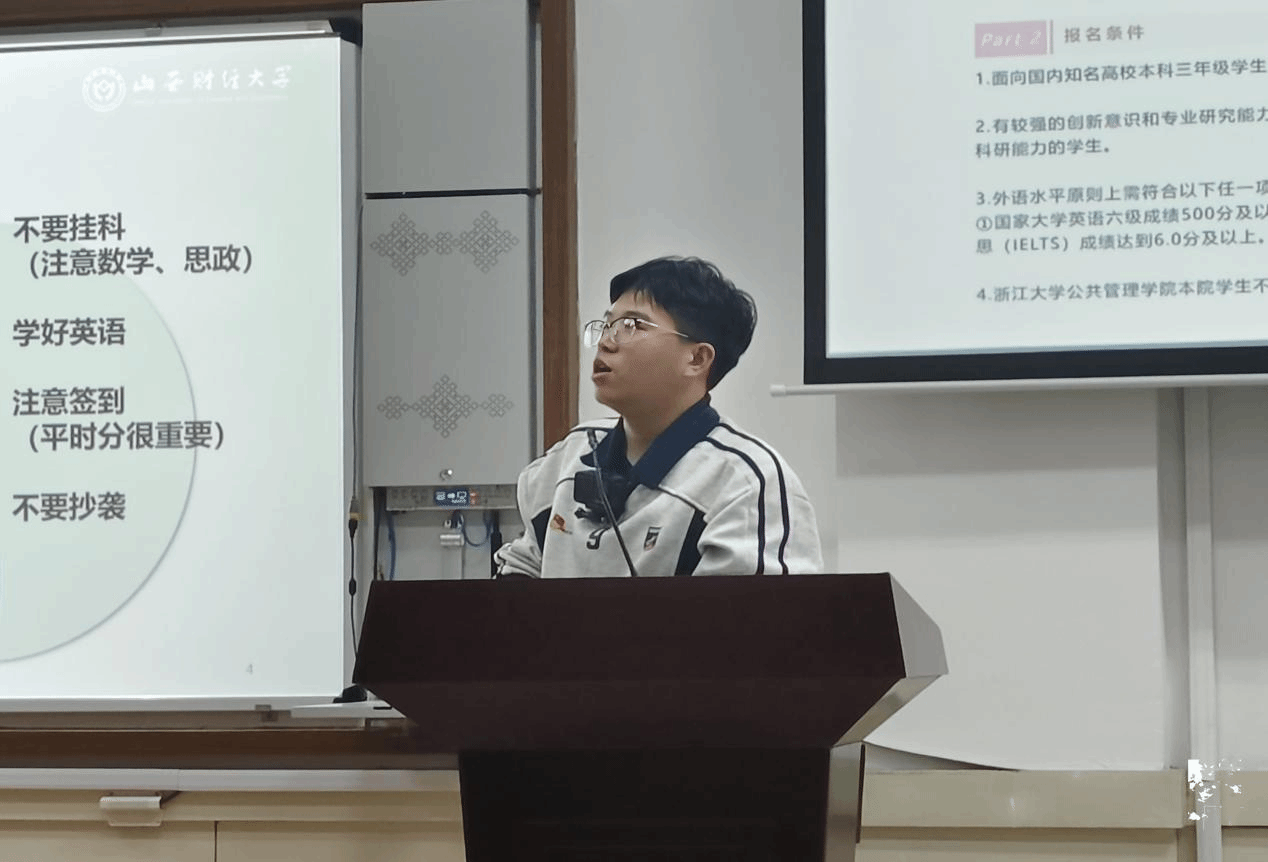 冯权是2021级土地资源管理2班的员工,六学期综合测评班级第一,获中国科学院大学直博资格,斩获多项国家级、省级奖项,发表1篇EI会议论文,收到四所高校硕士录取通知书。他全面分享了自己在学业、科研和生活经验,强调了优异成绩和扎实基础的重要性,鼓励同学们进行课堂讨论和课外实践,还推荐了部分潜力科创项目,分享了有效学习方式,同时,他提醒大家要注意身心健康,合理安排时间,保持积极心态,这些都对同学们具有重要指导意义。