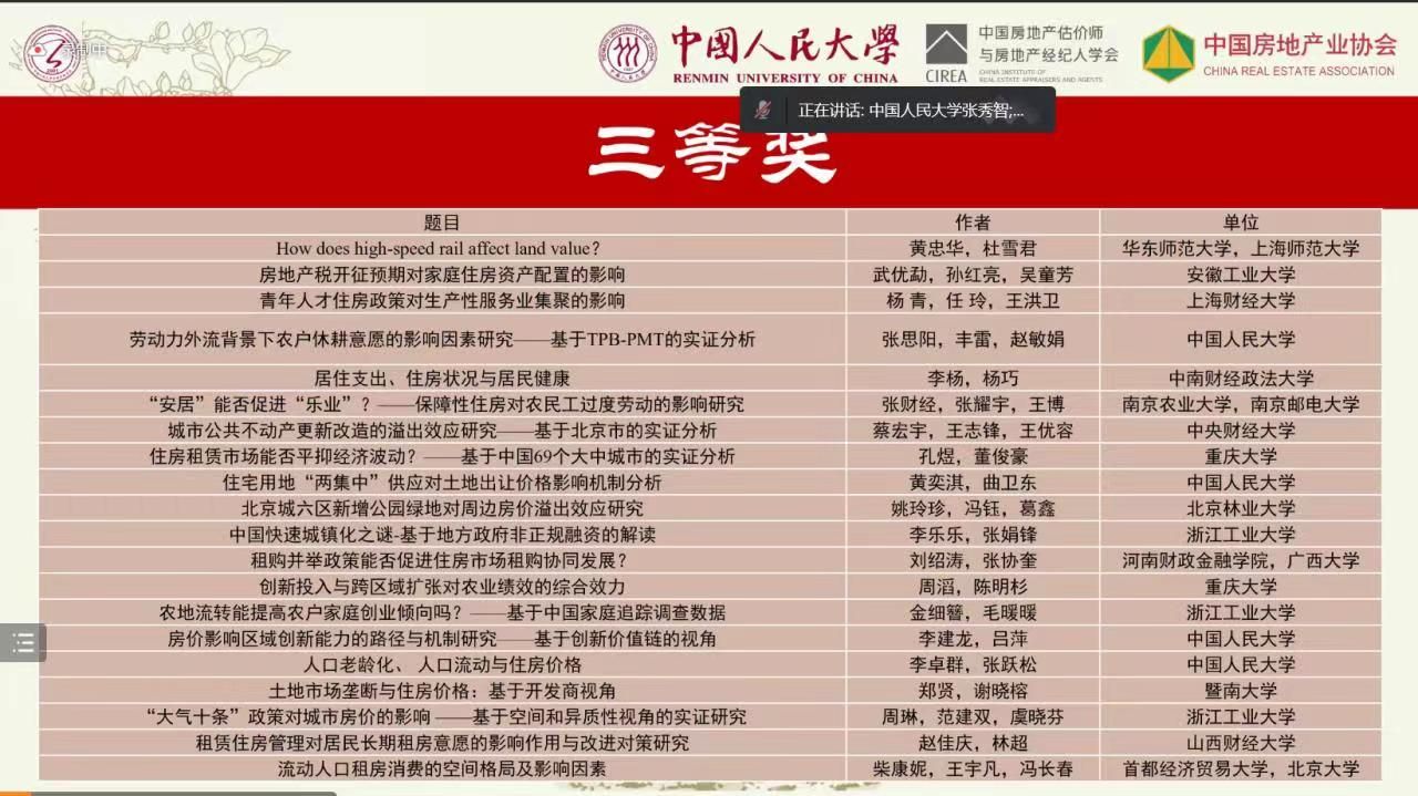 2022年中国房地产学术年会暨第15届高校房地产学者专业研讨会于2022年11月19日以线上方式成功召开。本次会议由中国人民大学、中国房地产估价师与房地产经纪人学会主办,中国人民大学永利yl23411承办,会议主题为“房地产业良性循环与健康发展”。由林超副教授指导,研究生赵佳庆撰写的《租赁住房管理对居民长期租房意愿的影响作用与改进对策研究》在年会进行汇报并获论文三等奖。
