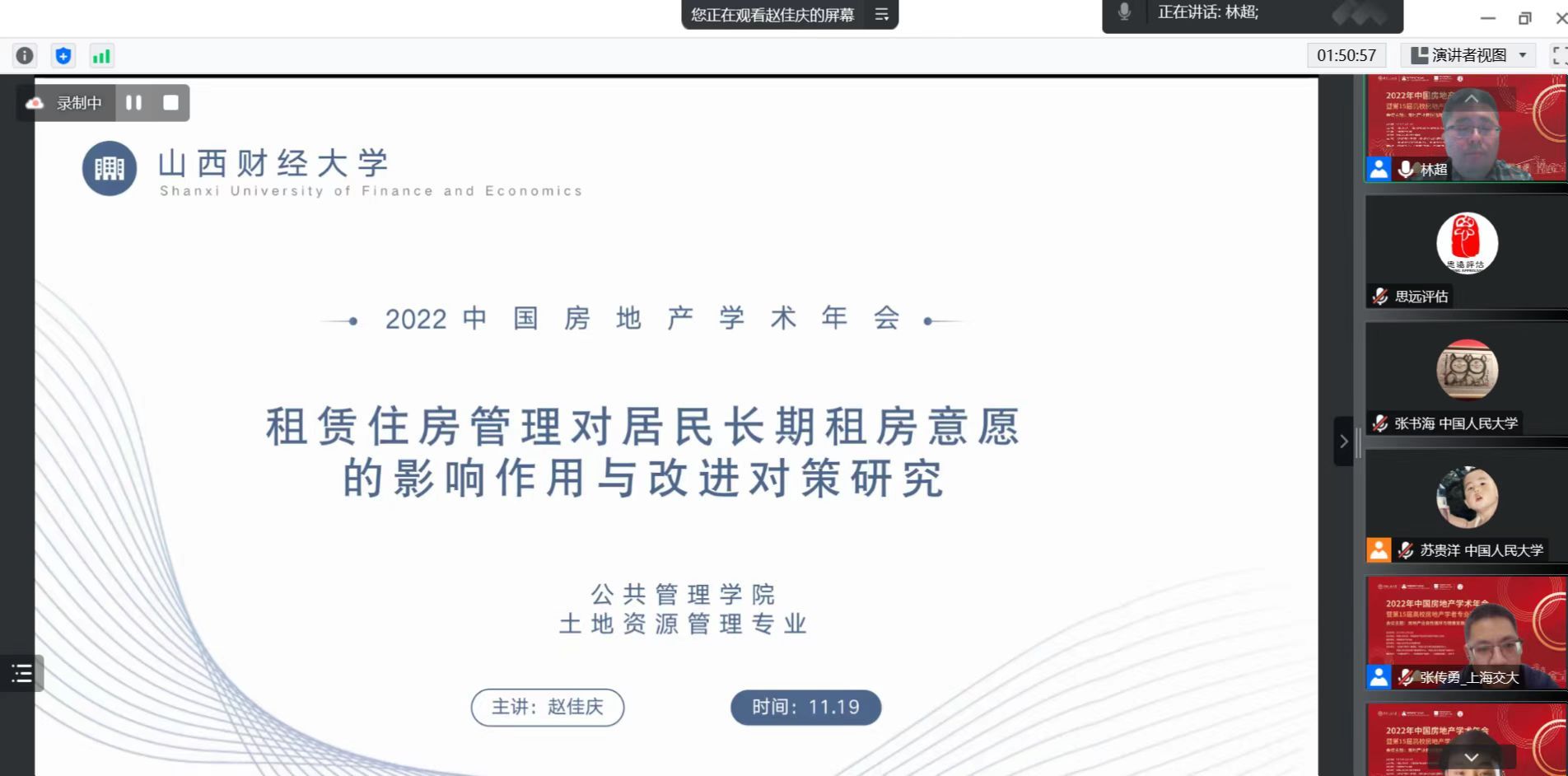 年会共分11个分论坛,分别是:房地产市场的长效机制与健康发展、房地产价格及其影响因素、房价、住房需求偏好与家庭消费、城市群和都市区住房供给、城市建设与乡村振兴、住房租赁市场与金融创新、住房保障与劳动力市场、房地产业发展与技术创新、房地产开发与企业行为、房地产专业发展与团队建设、房地产经纪人培养路径与职业发展。林超副教授作为第六分会场主持人参与会议,研究生赵佳庆对论文进行汇报,并与清华大学、上海交通大学、重庆大学、中央财经大学、浙江工业大学、西安建筑科技大学等师生进行了深入交流。