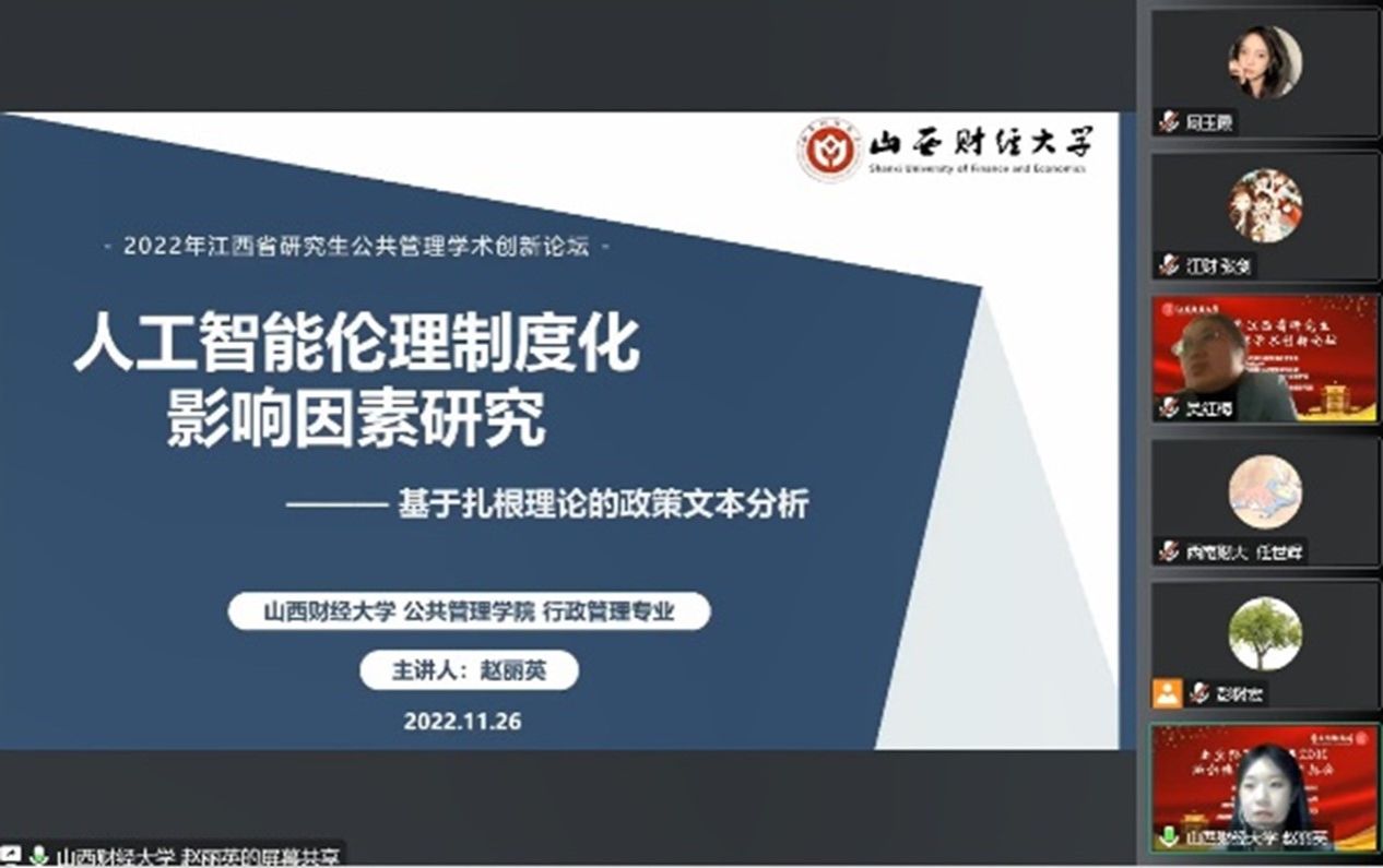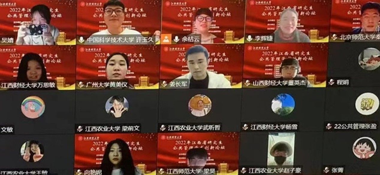 2022年11月26日,由江西省学位与研究生教育学会、江西财经大学主办,江西省高校公共管理学科联盟、江西财经大学财税与永利yl23411承办的2022年江西省研究生公共管理学术创新论坛以线上方式顺利召开。此次论坛的主题为“数字化时代的公共治理理论与创新”,来自全国公共管理学科的专家学者、硕博研究生共计290余人在线参会。公司2020级行政管理研究生王琼琼、2020级社会保障研究生董英杰、2021级行政管理研究生赵丽英三位同学应邀参会并发言。