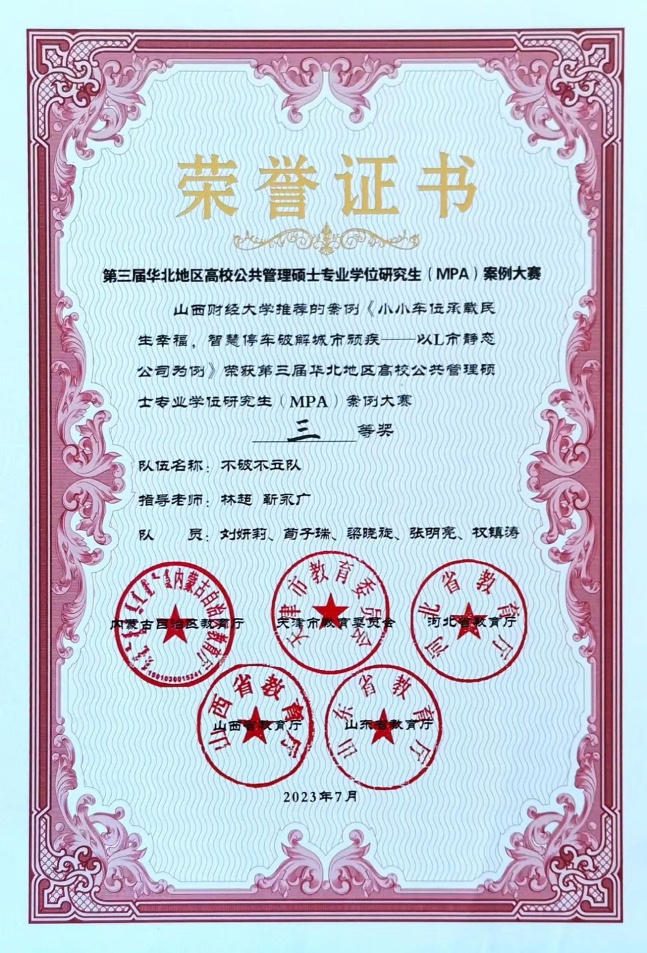 经过紧张而激烈的角逐,“不破不立队”荣获第三届华北地区高校公共管理硕士专业学位研究生(MPA)案例大赛三等奖。