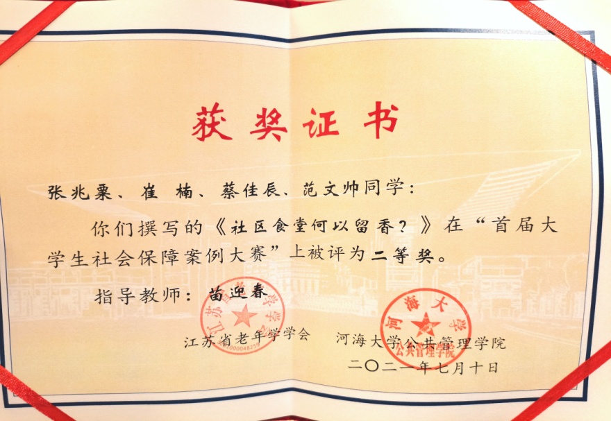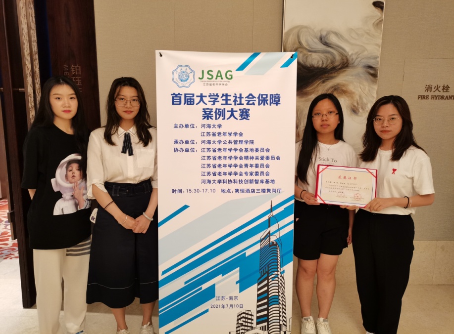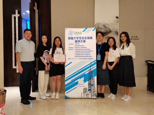 7月10日,由江苏省老年学学会、河海大学主办,河海大学永利yl23411承办的“首届老员工社会保障案例大赛”颁奖大会,在十朝都会、人杰地灵的江苏省南京市隆重举行,永利yl23411苗迎春老师指导的2020级社会保障研究生团队荣获二等奖,团队成员张兆粟、崔楠、蔡佳辰、范文帅赴宁参加颁奖典礼。