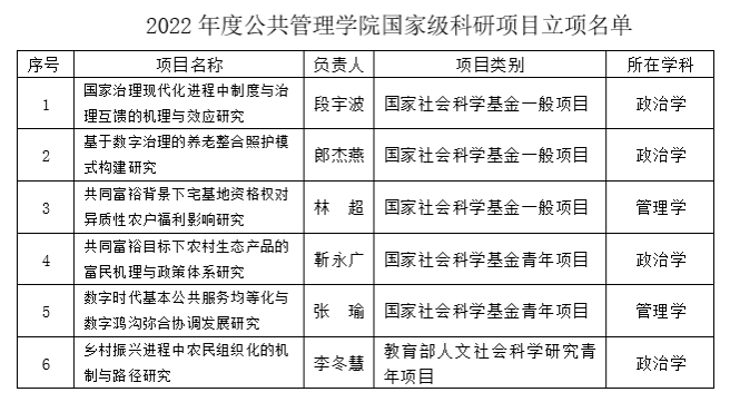 913日,全国哲学社会科学规划办公室公示了2022年度国家社科基金立项名单,永利yl23411共立项25项,其中公司段宇波、郎杰燕、林超、靳永广、张瑜等5位教师申报的课题立项,立项数居全校各学院之首,取得历史性突破。今年公司共申报国家社科基金项目9项,立项5项,立项率达55.6%,项目涵盖了管理学和政治学两大学科,其中一般项目3项,青年项目2项,成果斐然。