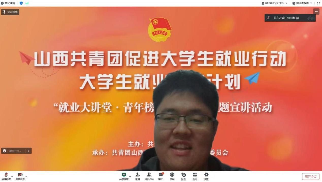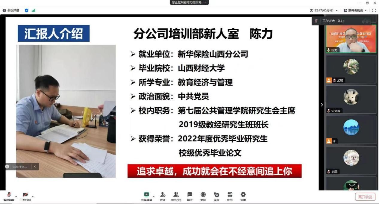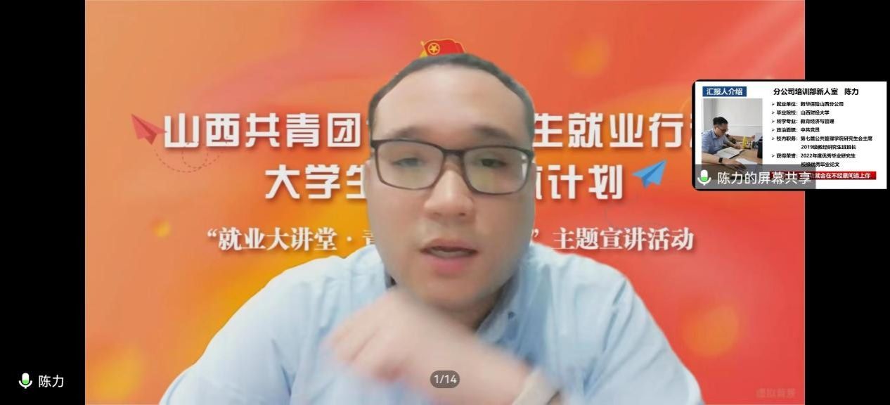 为深入实施老员工就业引航计划,引导青年学子立足实际、找准定位,树立理性的择业观、就业观,积极在乡村振兴、绿色发展、社会服务等领域争当排头兵和生力军,2023年12月14日下午,永利yl23411团委以线上腾讯会议形式组织开展“就业大讲堂·青年榜样进校园”主题宣讲活动。本次宣讲活动特邀2022年度优秀毕业研究生陈力和2023优秀毕业本科生韦自强作为分享人,会议由团委书记王琼主持,各团支部代表踊跃参加。