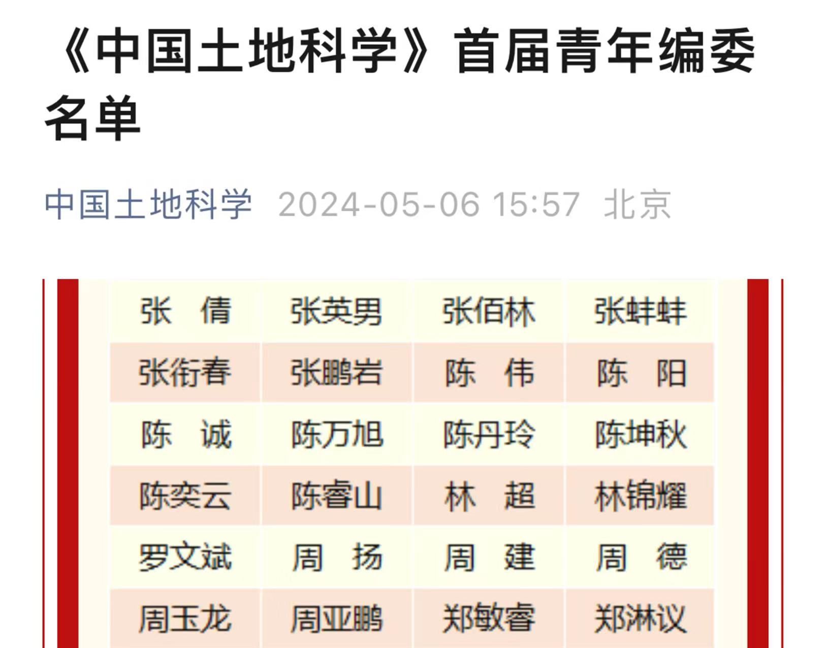 为进一步推动我国土地科学学科发展,提升《中国土地科学》期刊学术影响力,搭建更具活力的学术交流平台,并为期刊编委会培养后备力量,编辑部启动了首届青年编委招募活动,得到了广大青年学者的积极响应和踊跃支持。林超副教授长期致力于土地制度与经济研究,入选青年编委不仅是对公司土地资源管理专业发展成果的肯定,而且有助于增进与国内其他高校、科研院所土地资源管理领域青年科技人才的交流,助推专业高质量发展。